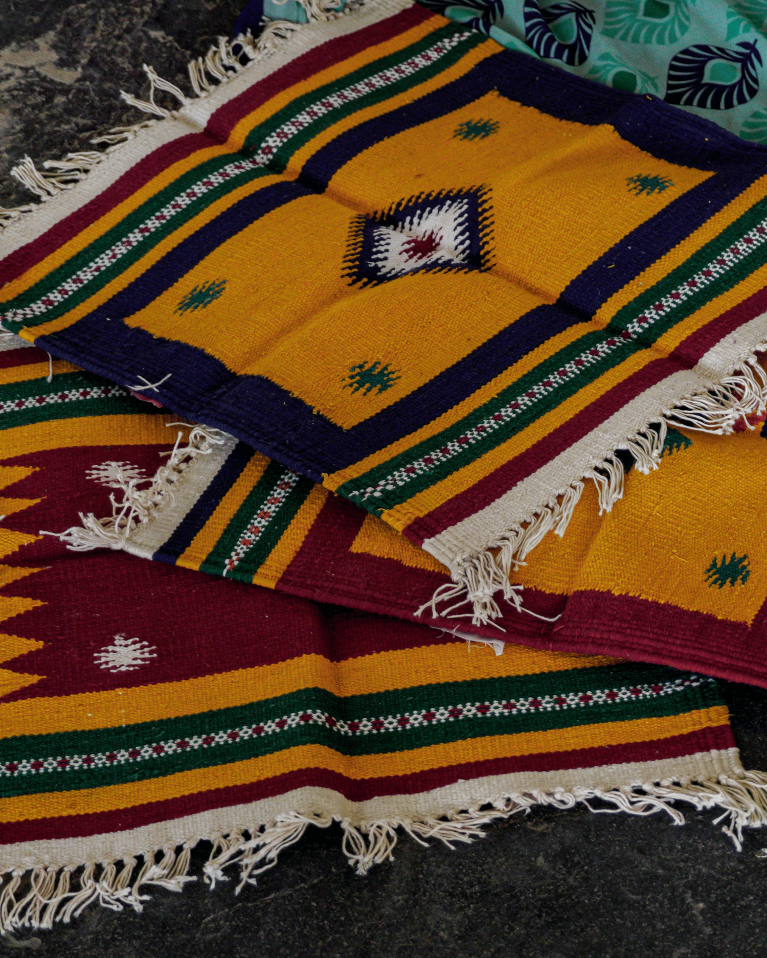 Hand-knotted dhurries featuring traditional geometric patterns. Woven by skilled artisans using techniques passed down through generations of women. Made on traditional pit looms, each piece takes weeks to complete.