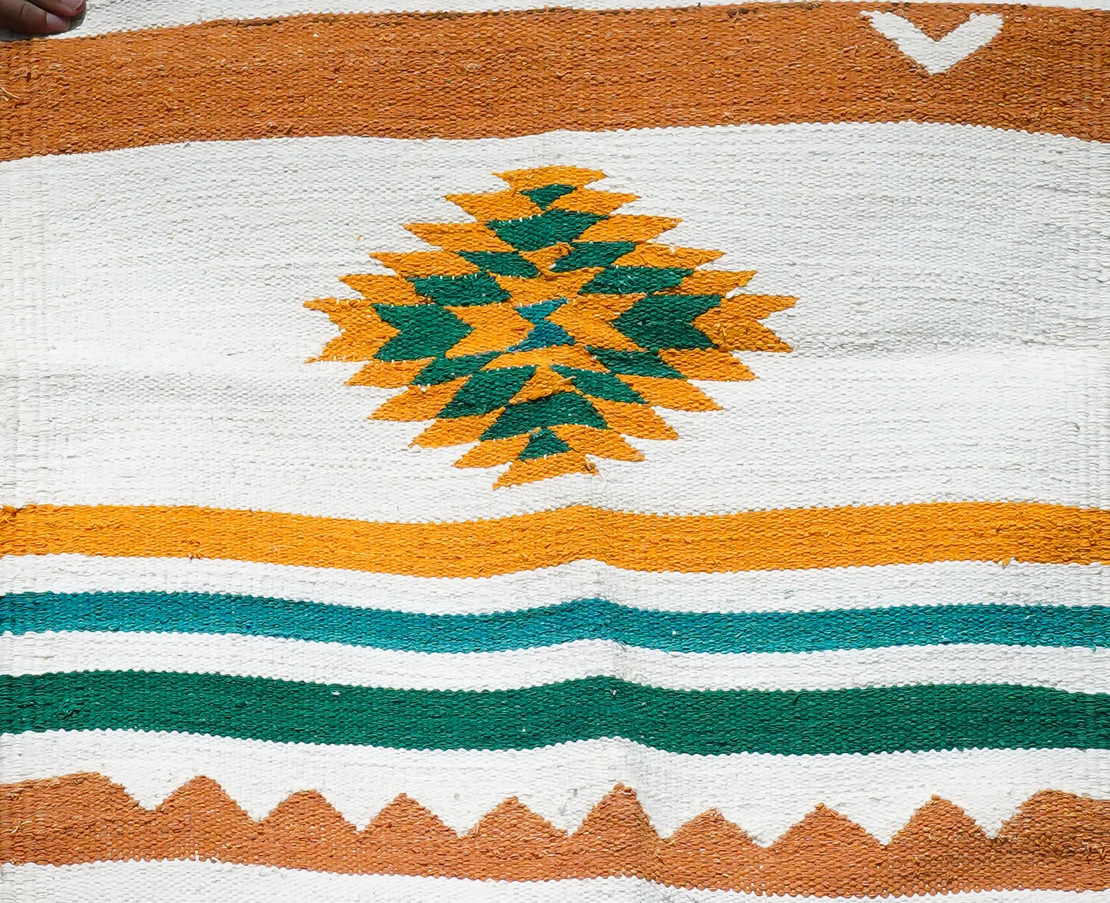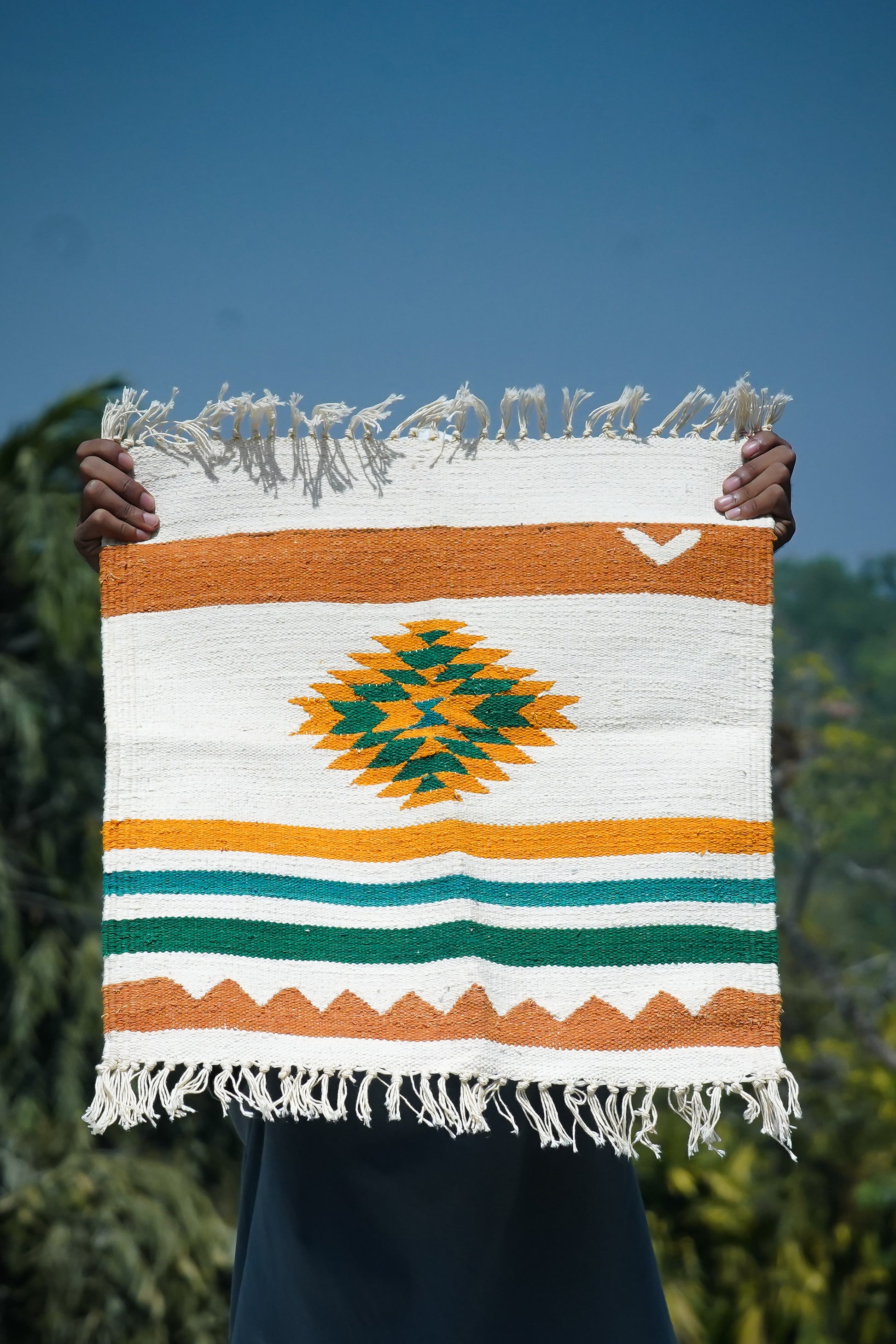 Navalgunda Dhurrie design features bold geometric motifs, clean linear patterns, and high-contrast colour blocks woven in a symmetrical composition. The designs are brought to life using pure cotton yarn as the primary raw material, often combined with naturally dyed threads for rich, lasting colours. This thoughtful use of cotton and natural dyes ensures the dhurrie remains durable, breathable, and visually striking while staying true to its traditional craft.