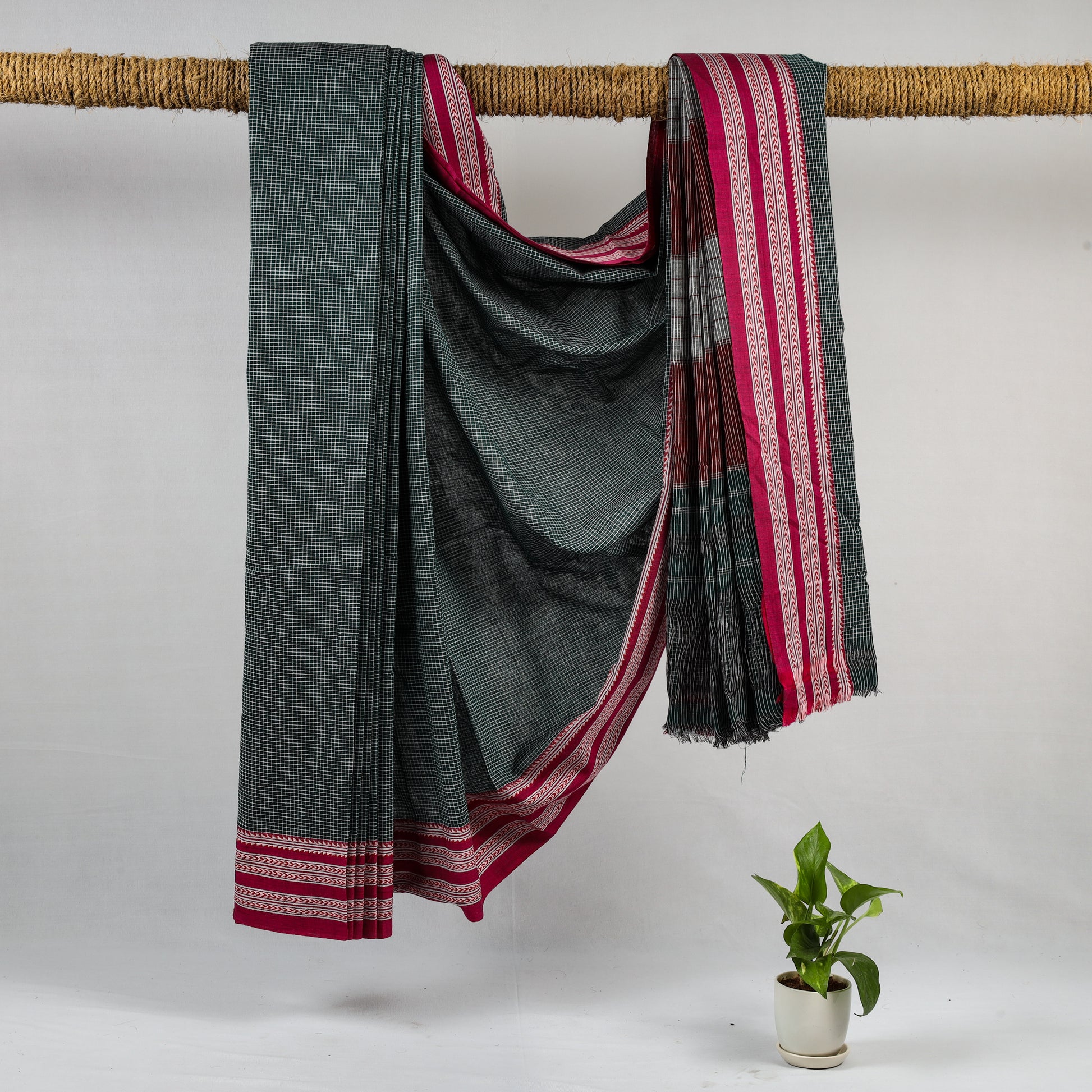 A handwoven cotton saree with a bold black checked body, giving the weave a clean, graphic character. The checks are balanced by a striking Gomi Dhadi border in deep red, woven with traditional linear detailing that frames the drape beautifully. Made in breathable cotton, it feels light, easy, and comfortable for everyday wear.