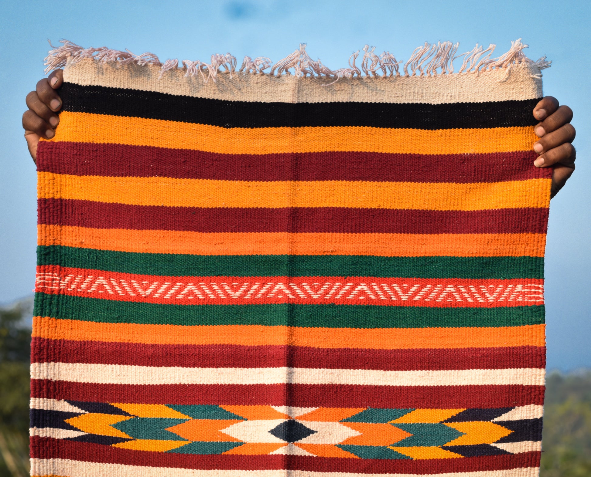 A vibrant Navalgund dhurrie in rich maroon–mustard tones with bold tribal motifs and a striking central diamond. Handwoven on traditional pit looms, it features layered stripes, colourful patterns, and warm earthy hues. Perfect for adding character to walls, floors, tables, or any cozy corner with authentic North Karnataka craftsmanship.