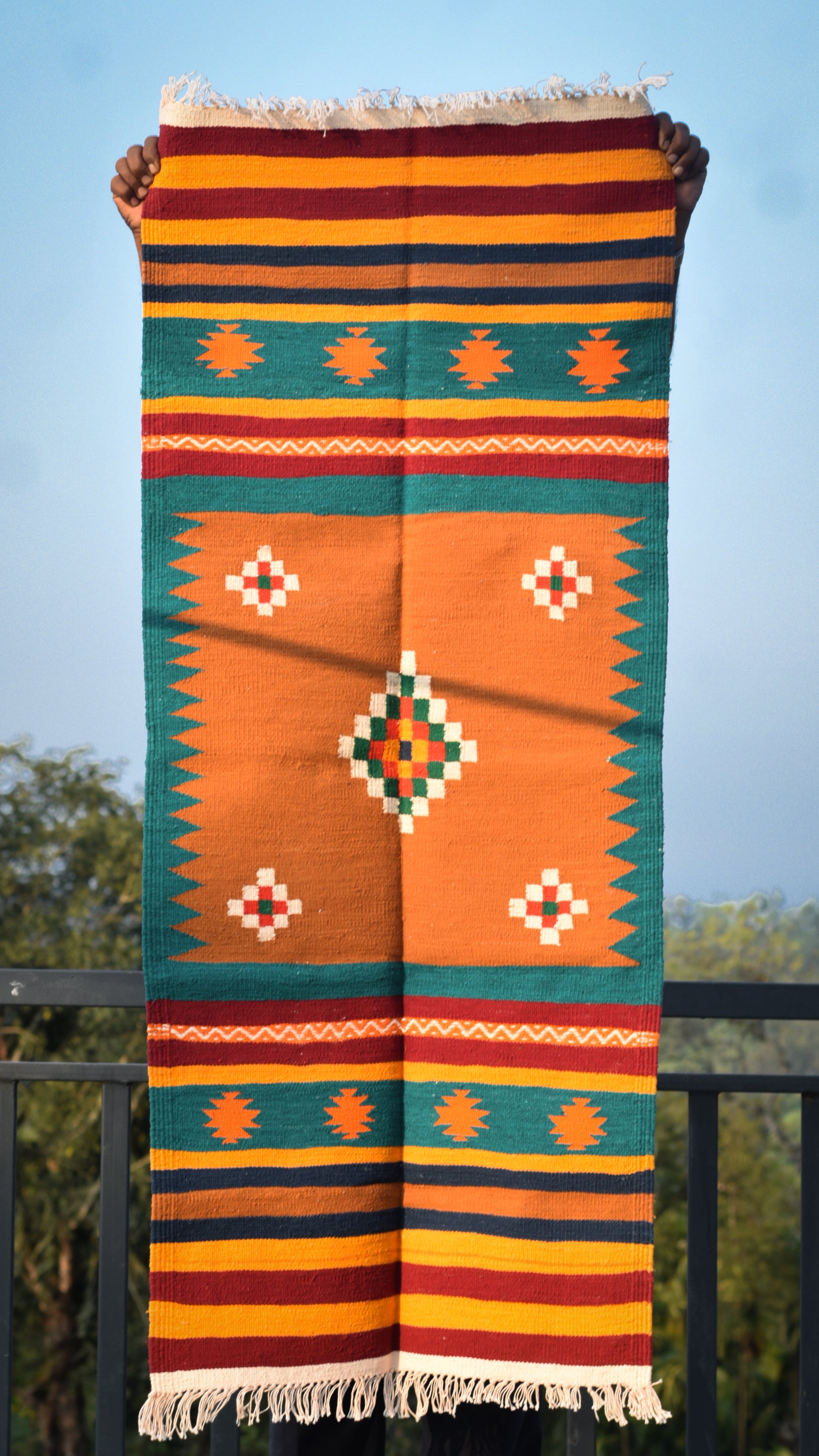 A bold Navalgund dhurrie woven in warm mustard and deep teal with striking diamond motifs. Crafted on traditional pit looms, it features layered stripes, tribal patterns, and rich colours that brighten any corner. Perfect for walls, floors, tables, or cozy décor spaces — a beautiful touch of North Karnataka craftsmanship.