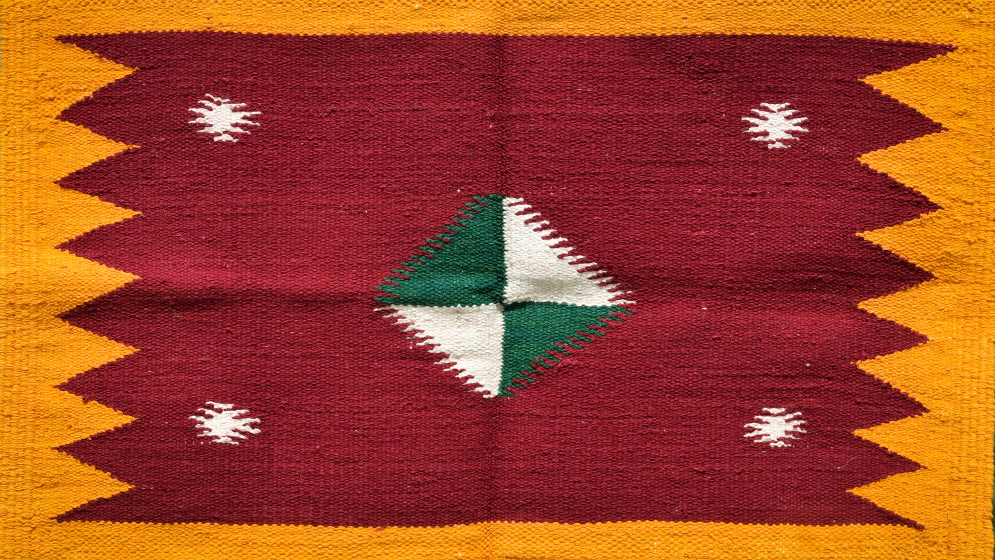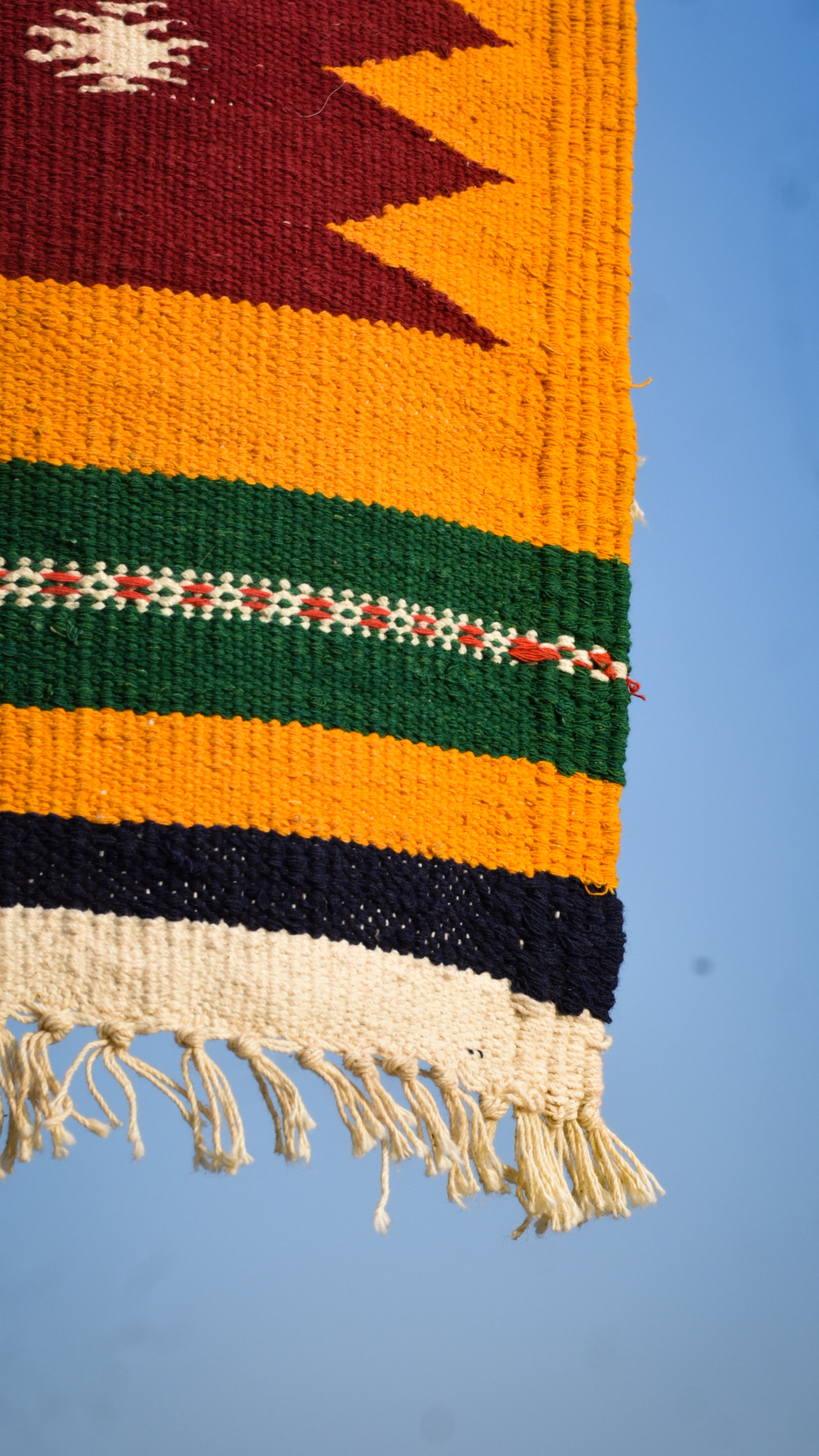 A Navalgund dhurrie crafted in rich maroon–mustard tones with a bold central diamond motif in green and ivory. Handwoven on traditional pit looms, it carries classic stripes, tribal details, and vibrant colour play. Perfect for walls, tables, shelves, or any cozy corner that needs a touch of North Karnataka craftsmanship.