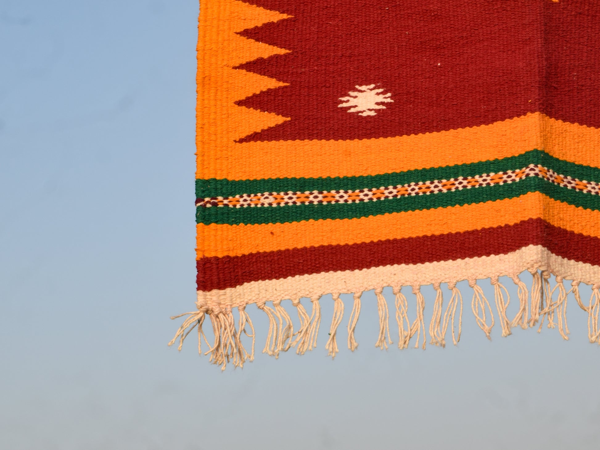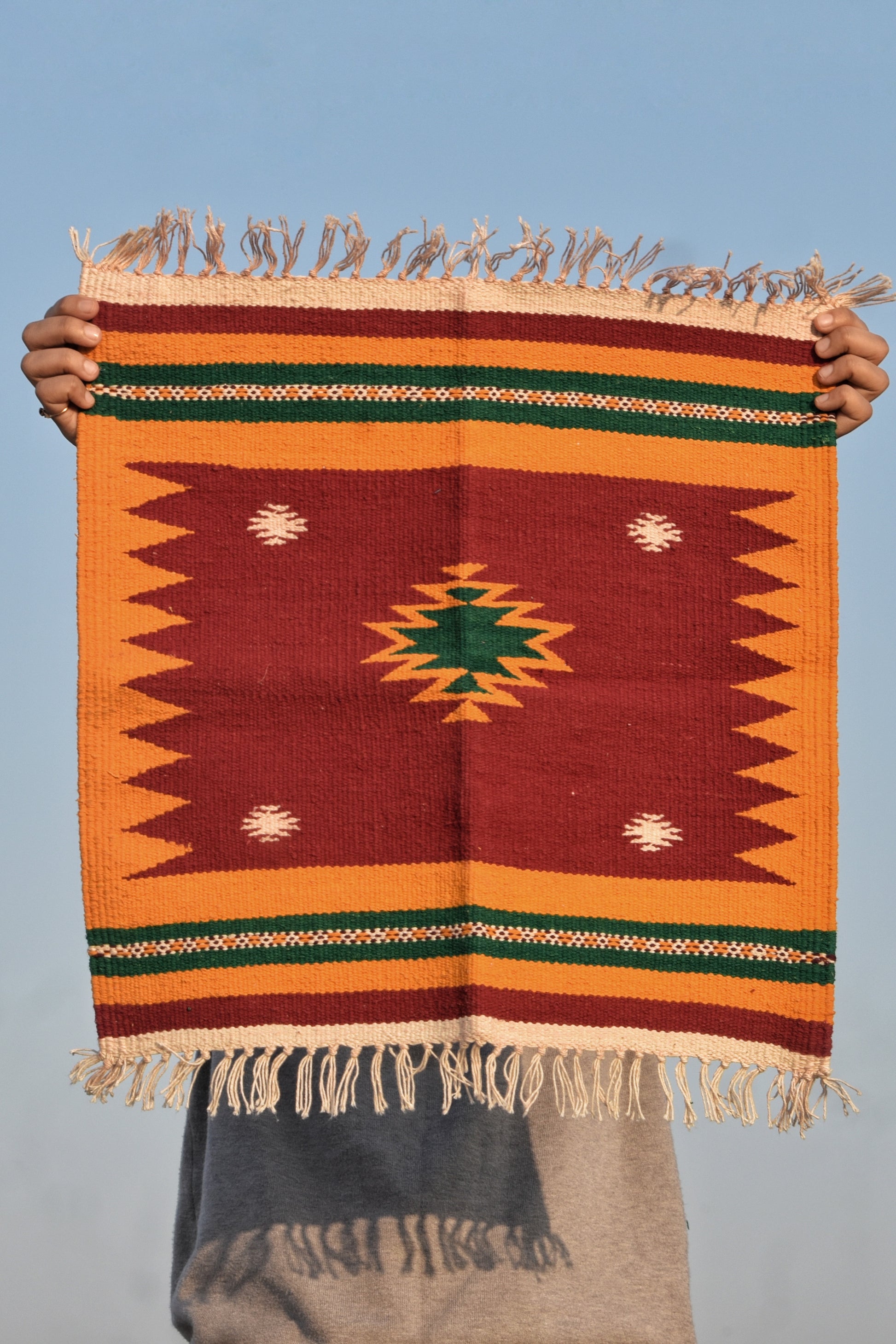 A radiant handwoven dhurrie featuring a forest green stepped diamond at its center, set against a deep maroon field and framed by warm marigold borders. Accented with teal and ivory patterned bands, this compact piece reflects the bold geometry of Navalgund’s GI-tagged weaving tradition — perfect for adding colour, warmth, and handcrafted character to any corner.