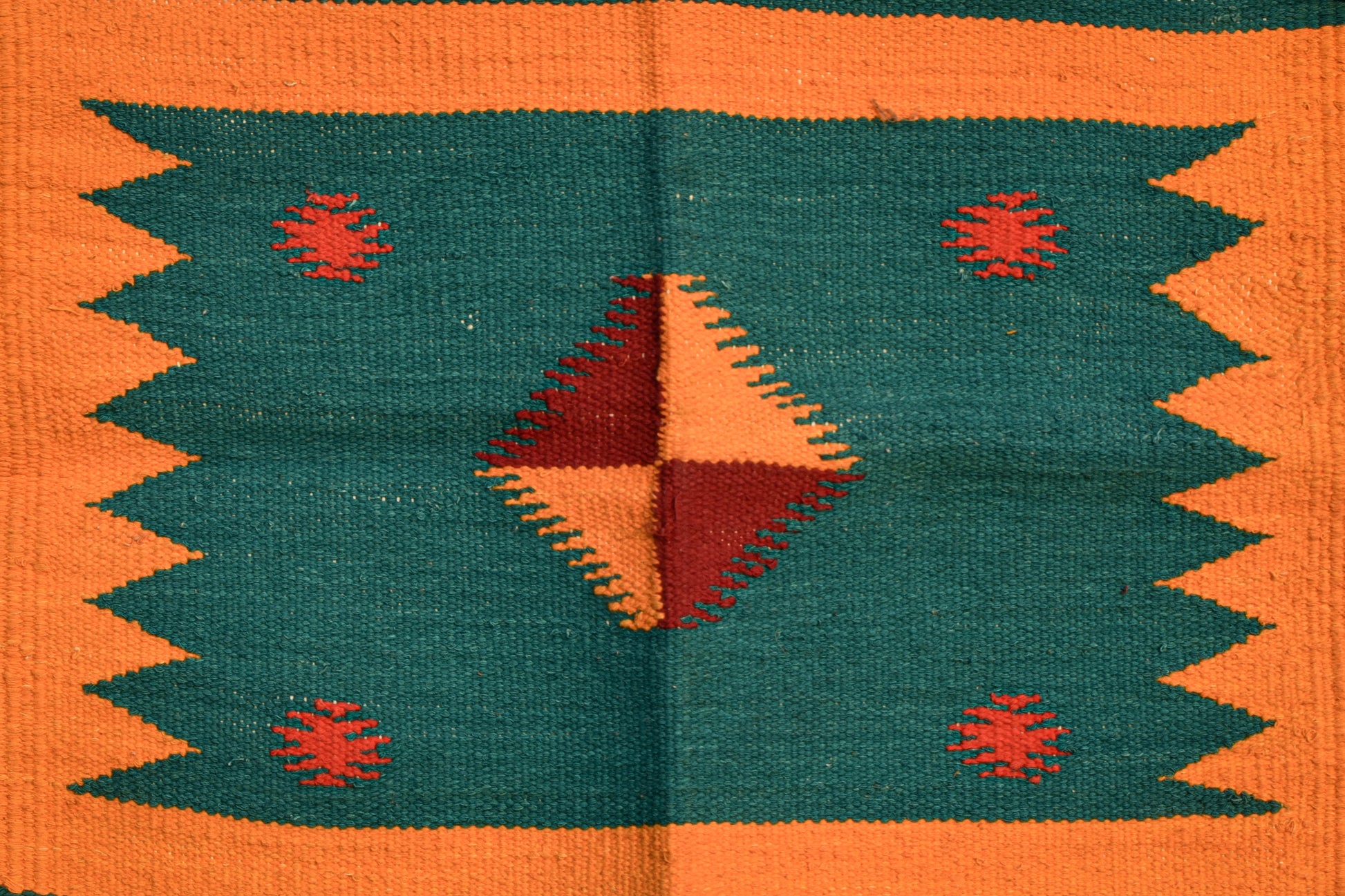 A vibrant handwoven dhurrie showcasing a layered green diamond motif at the center, set against a rich maroon field and framed by bold mustard borders. Accented with teal, ivory, and fine patterned bands, this compact piece reflects the geometric elegance of Navalgund’s GI-tagged weaving tradition perfect for adding warmth and character to small spaces.