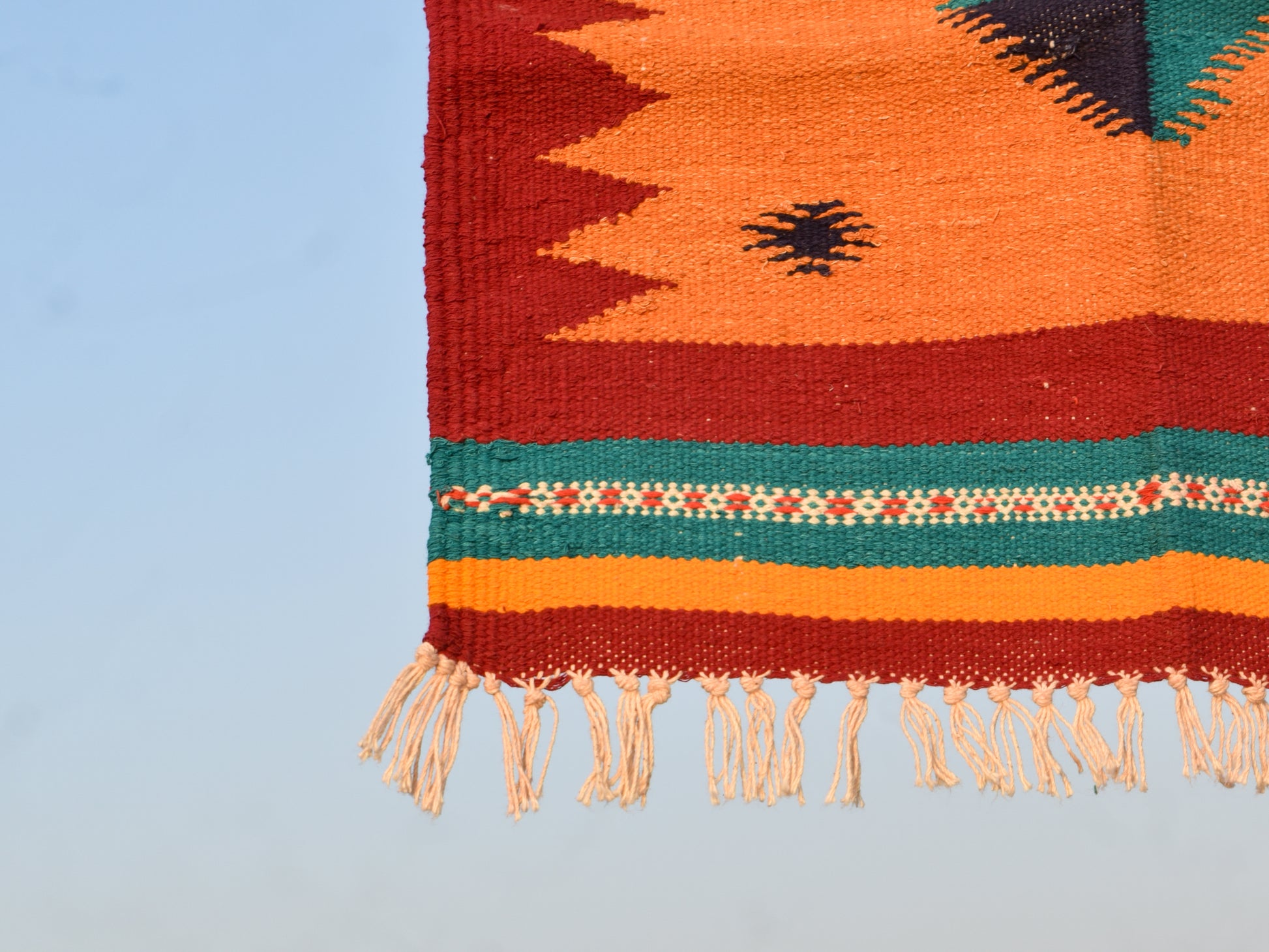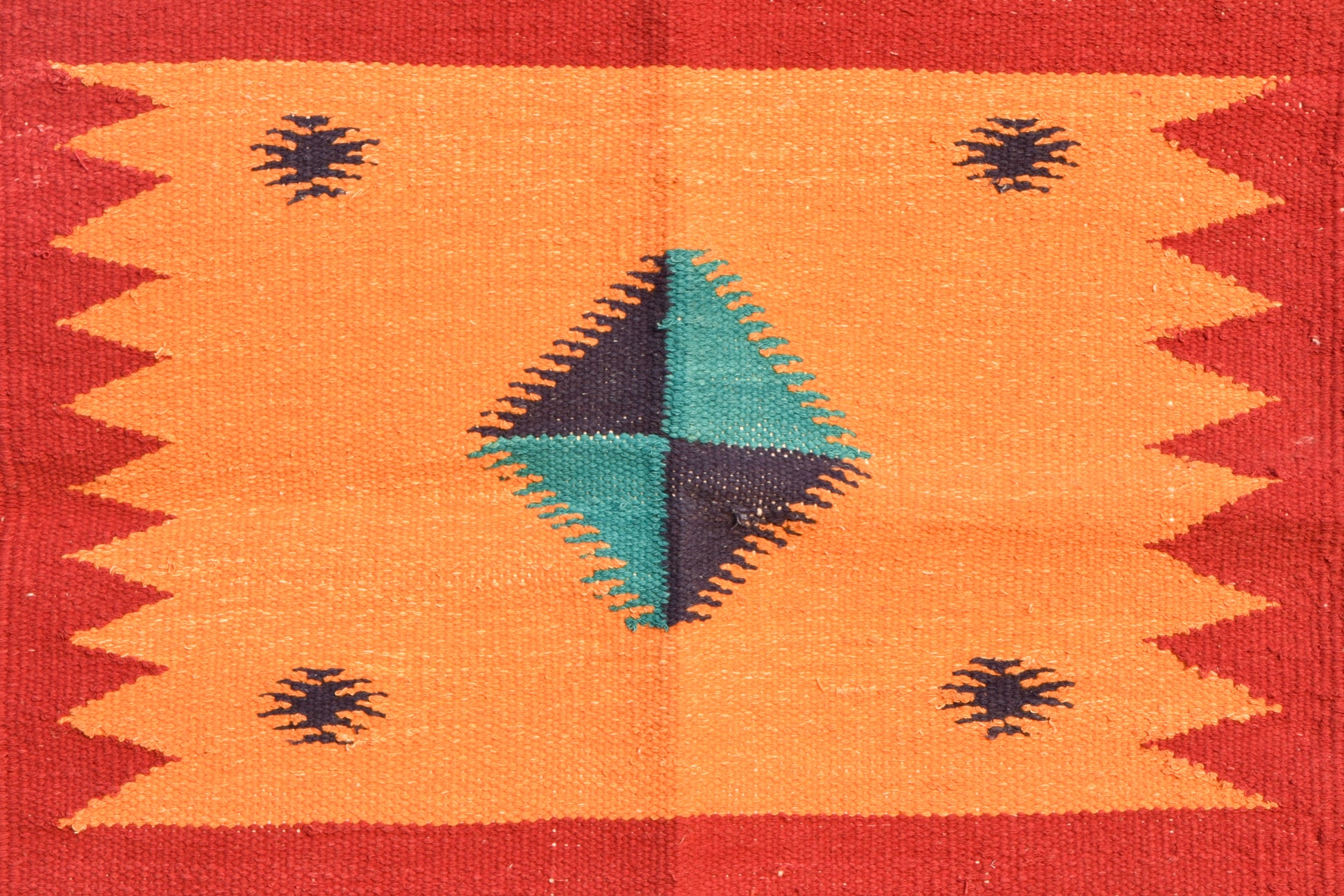 A striking handwoven dhurrie featuring a four-point diamond motif in teal and charcoal at the center, set against a warm rust-orange field and framed by deep maroon zigzag borders. Accented with forest green and ivory bands, this compact piece reflects the bold geometry of Navalgund’s GI-tagged weaving tradition — perfect for adding warmth, texture, and artisanal character to small spaces.