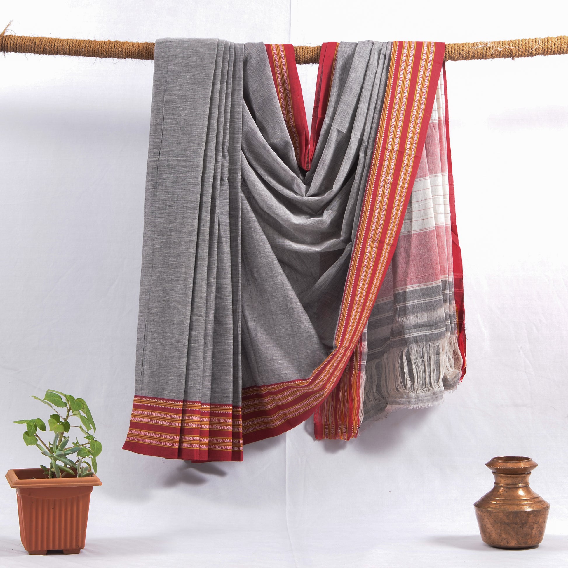 This elegant Ash Grey Handloom Cotton Saree with a deep red and golden Gadidhadi border adds a touch of sophistication to your everyday style. The subtle grey shade gives a refined contemporary feel, while the contrasting festive pallu enhances traditional charm. Soft, breathable, and easy to drape — perfect for office, casual outings, poojas, and special events.