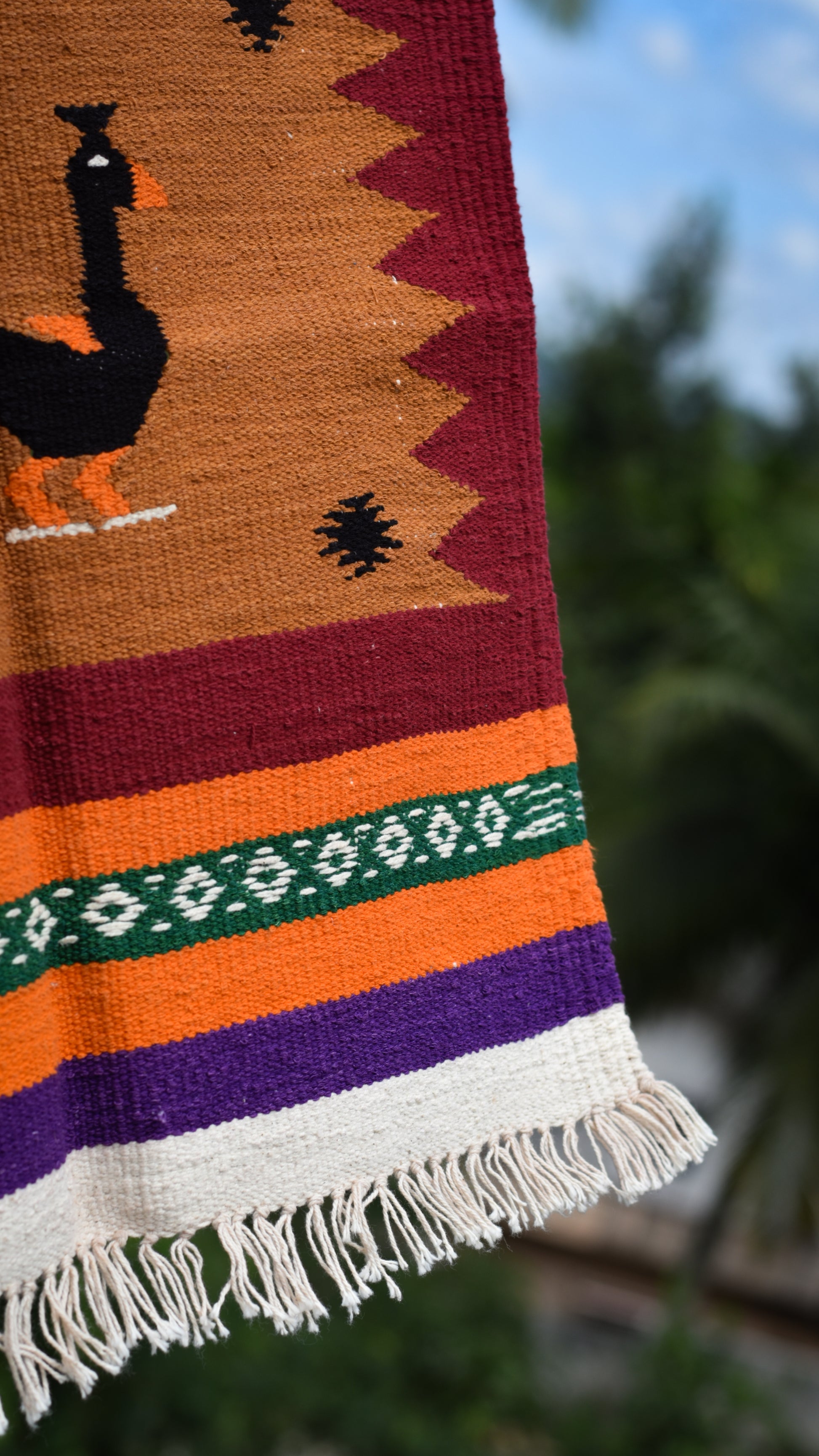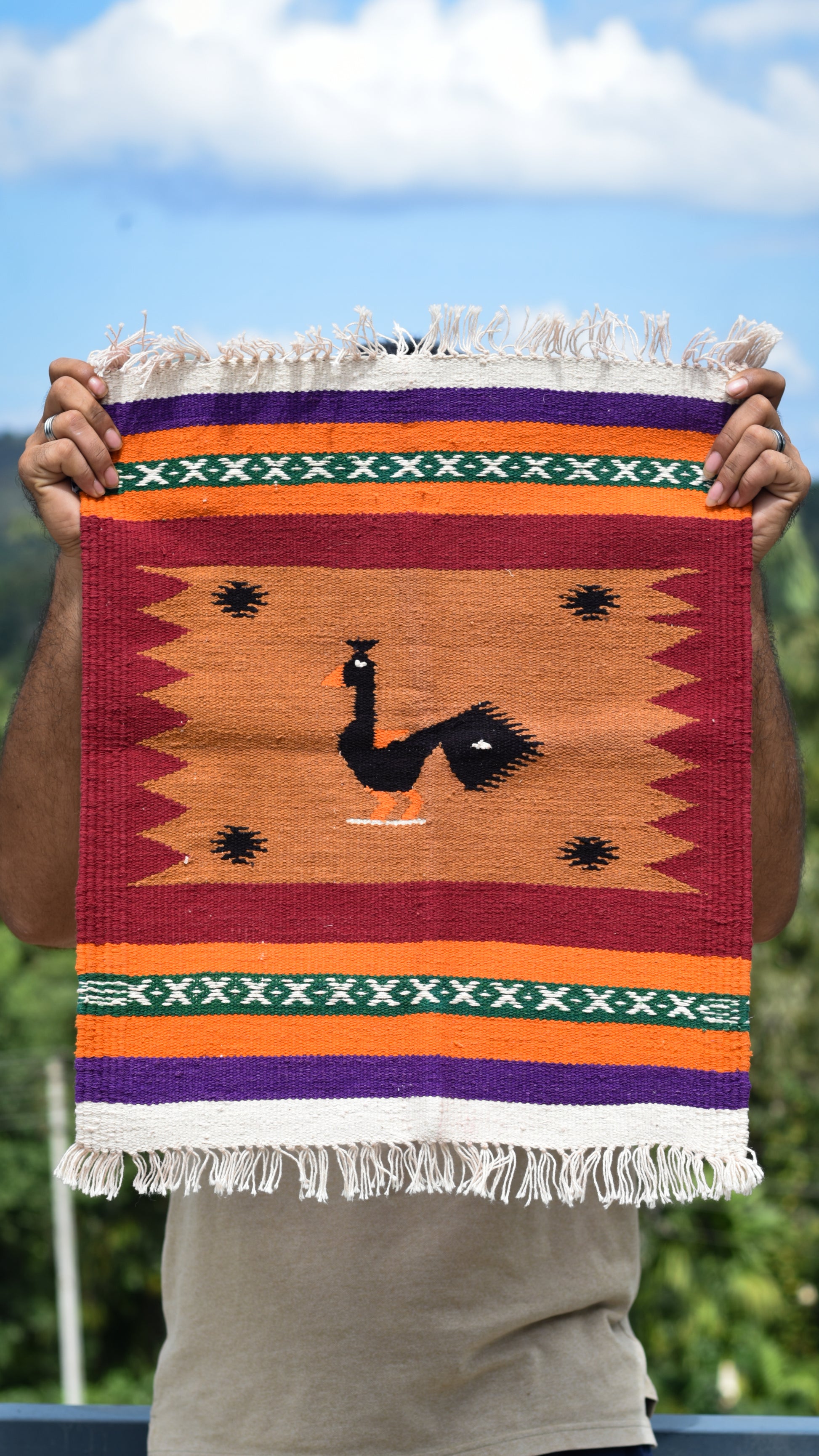 A beautifully handwoven dhurrie featuring a bold black peacock at the center, framed by a warm ochre panel and rich maroon edges. Accented with green tribal bands and purple–orange stripes, this piece carries the signature Navalgund folk style in a compact, decorative format.