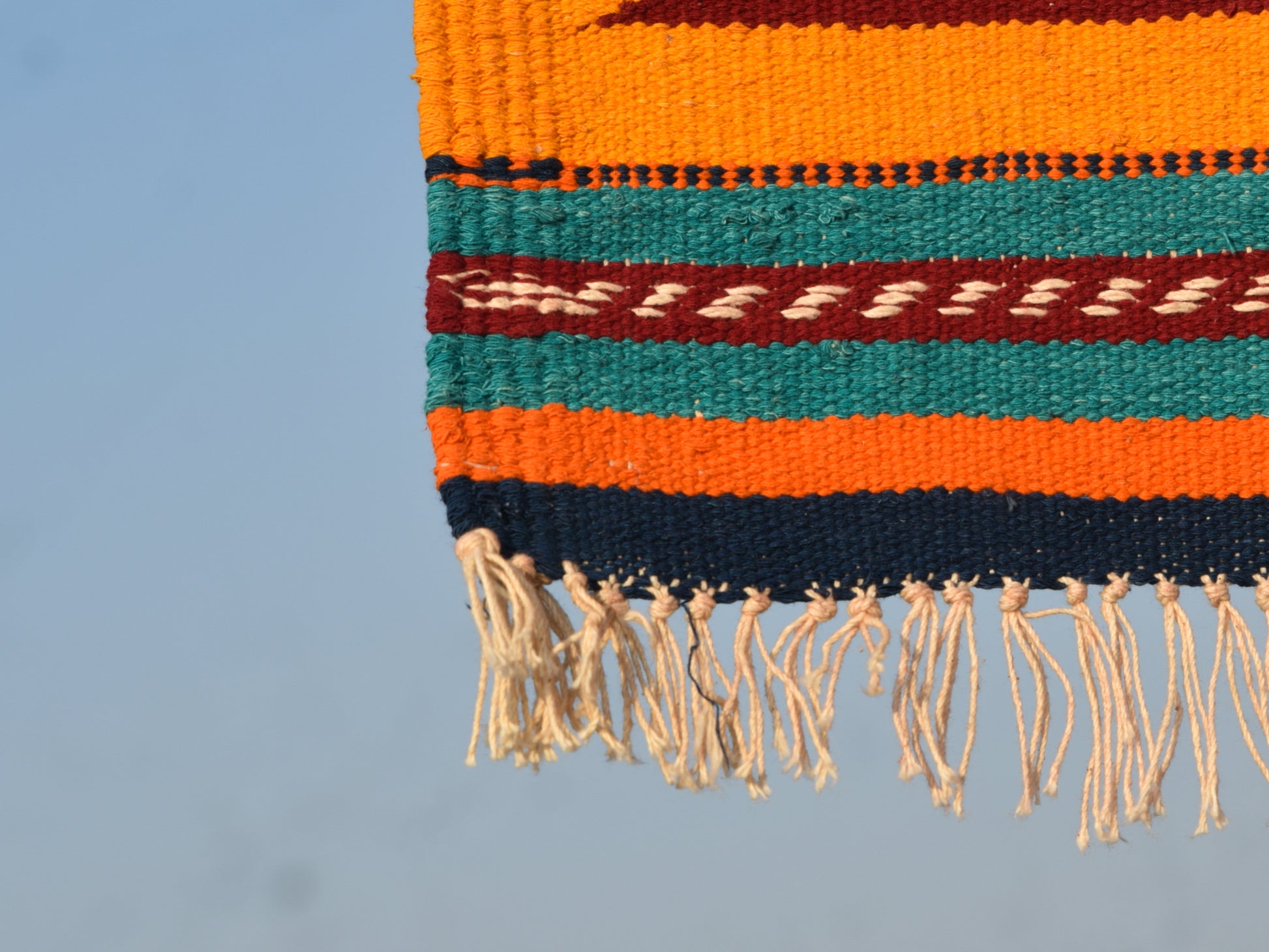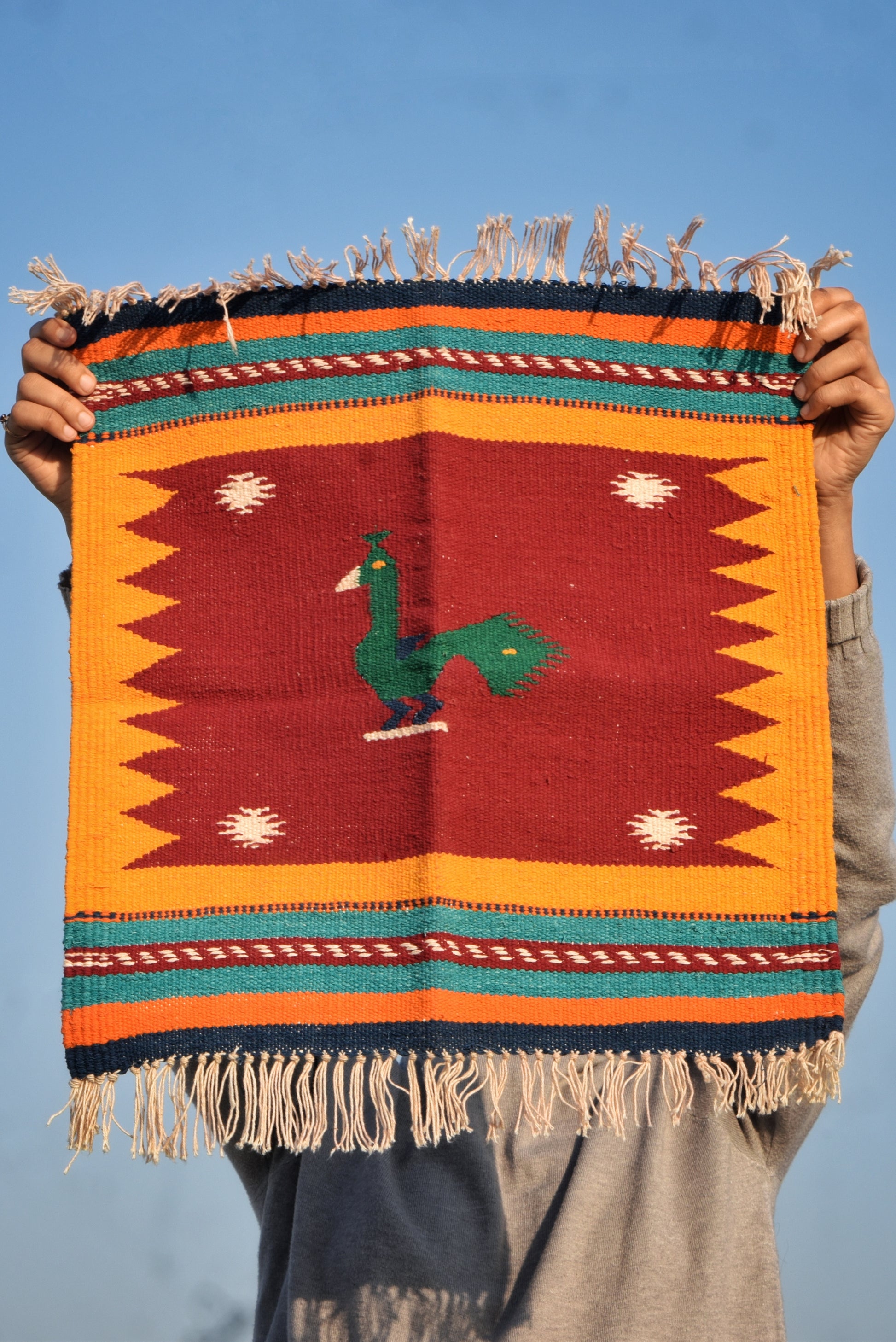 A beautifully handwoven dhurrie featuring a bold green mor (peacock) at the center, set on a rich maroon field and framed by a warm mustard zigzag border. Accented with teal, navy and orange bands, this piece carries the signature Navalgund GI-tagged weaving tradition in a compact, decorative format.
