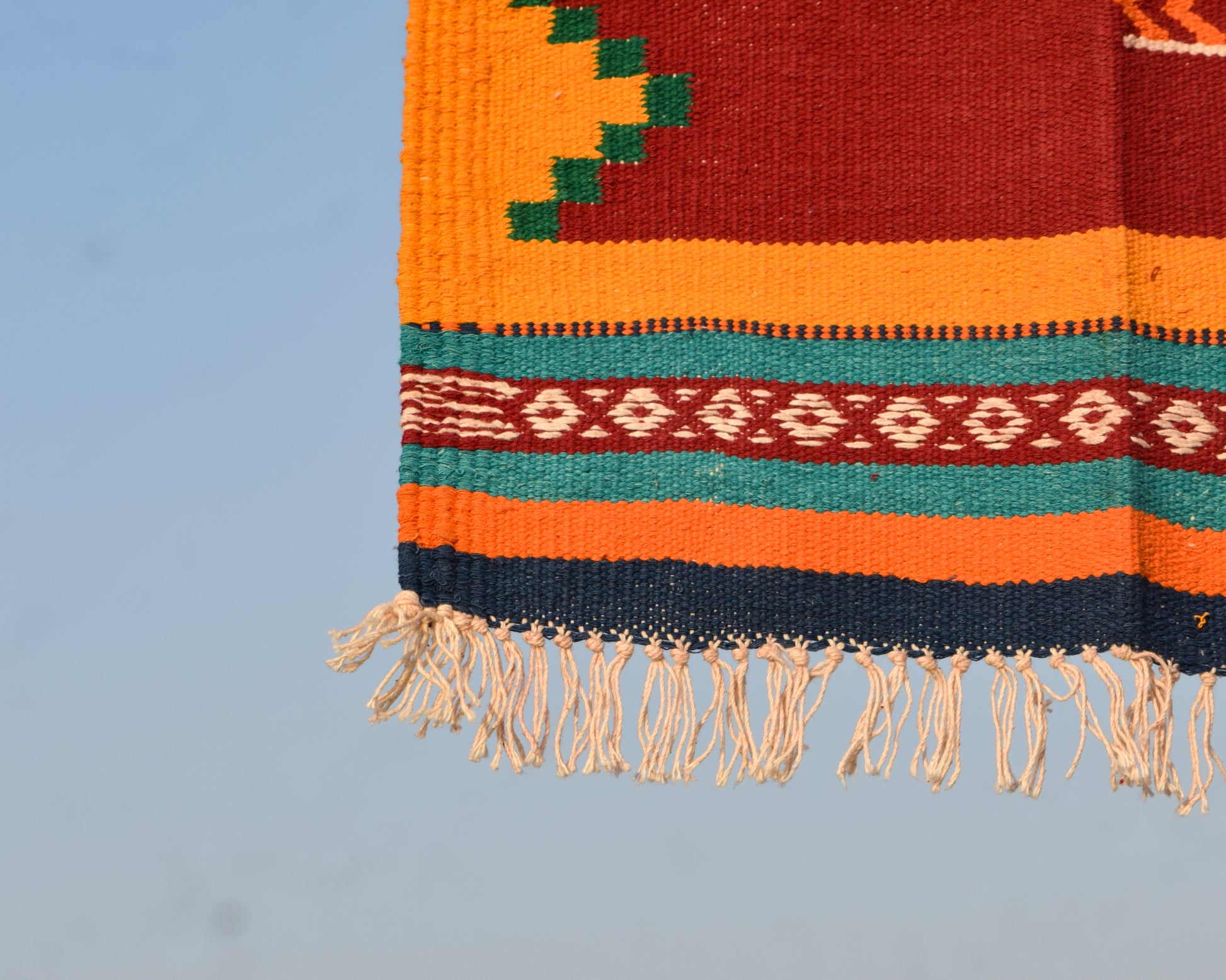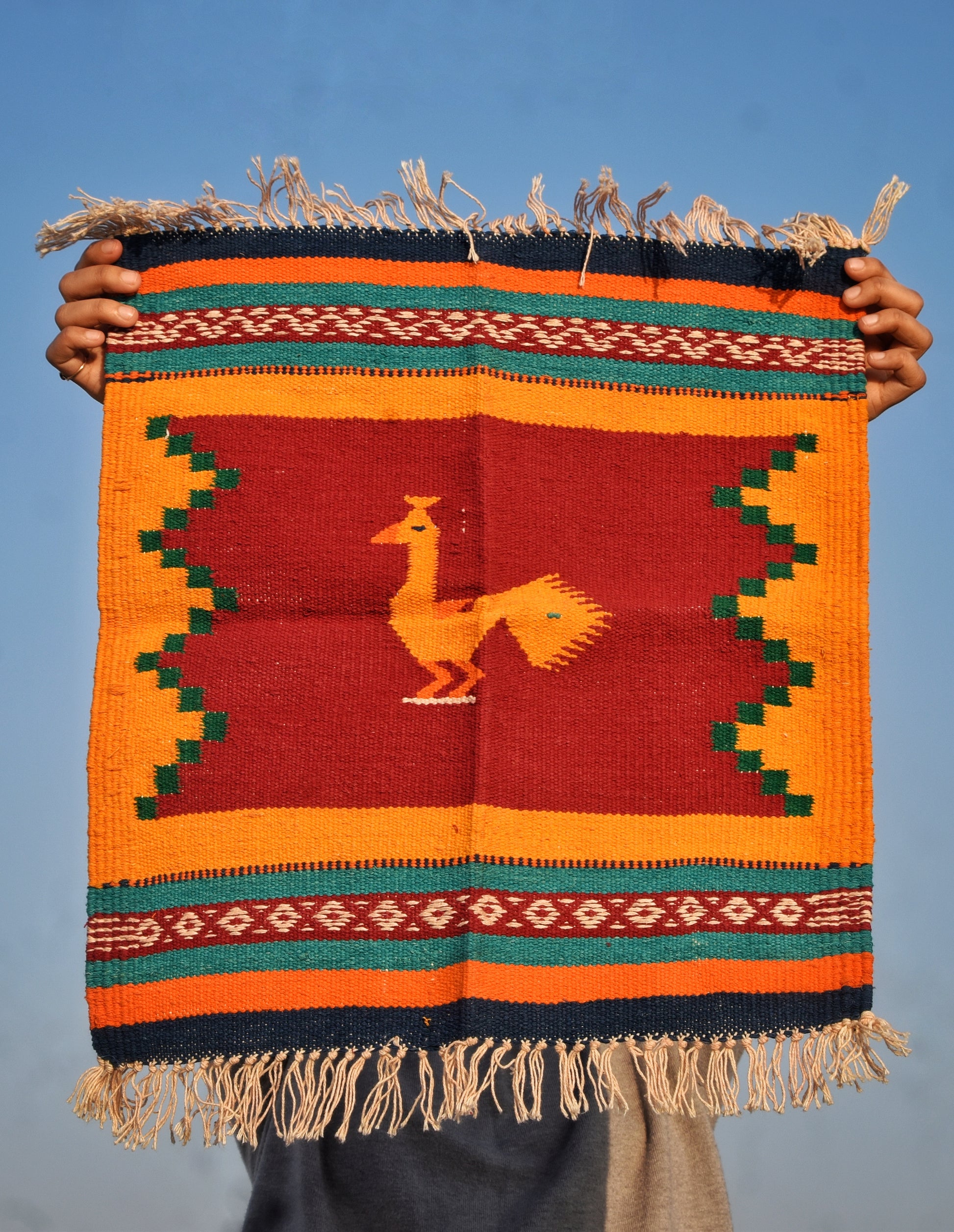 A beautifully handwoven dhurrie featuring a bold yellow mor (peacock) at the center, set against a rich maroon field and framed by a warm mustard border with green stepped edges. Accented with teal, navy and orange bands, this piece reflects the signature Navalgund GI-tagged weaving tradition in a compact, decorative format.