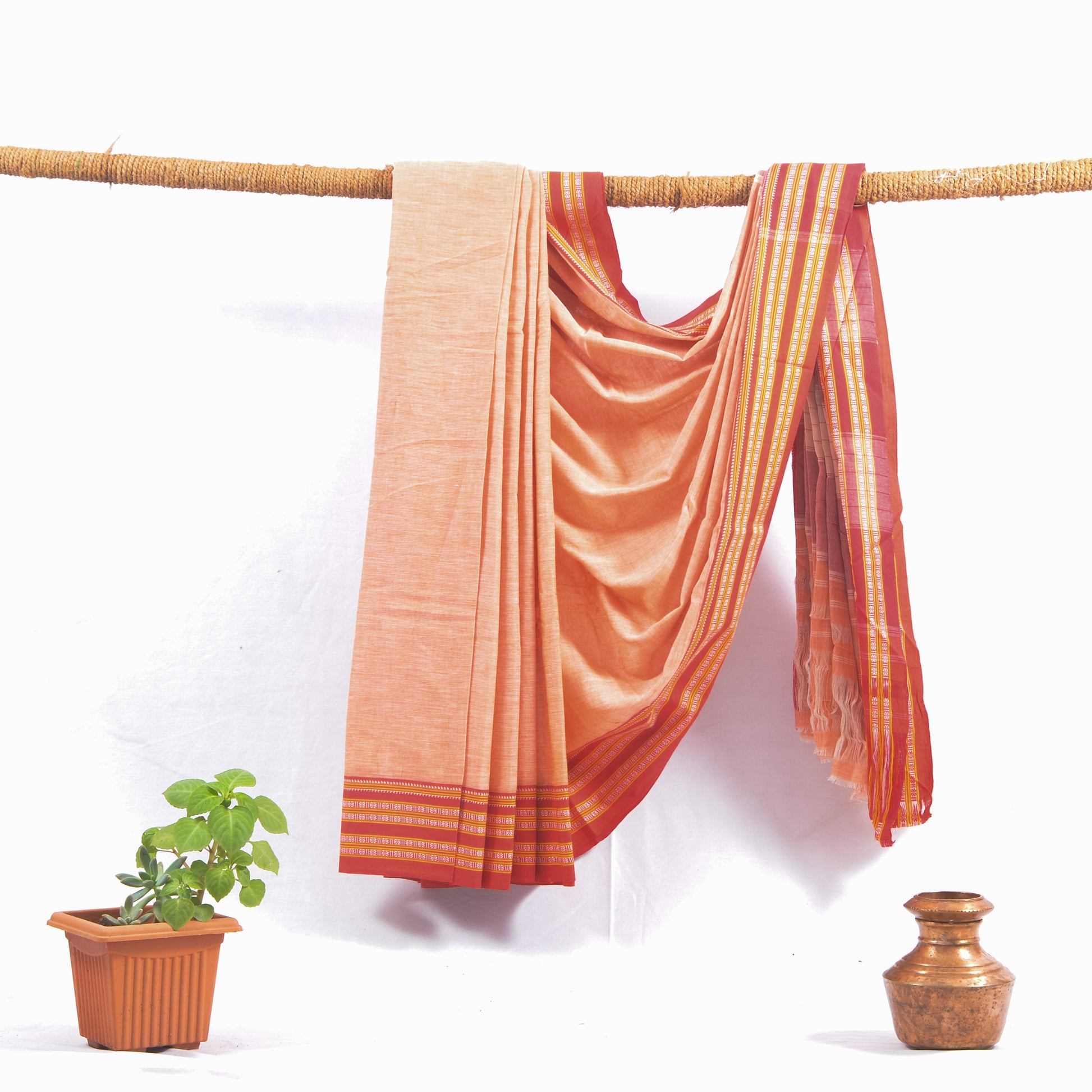 The sarees are primarily woven using cotton yarn counts such as 2/40 for warp and 2/40 or 2/60 for weft, sourced from certified suppliers like NHDC.