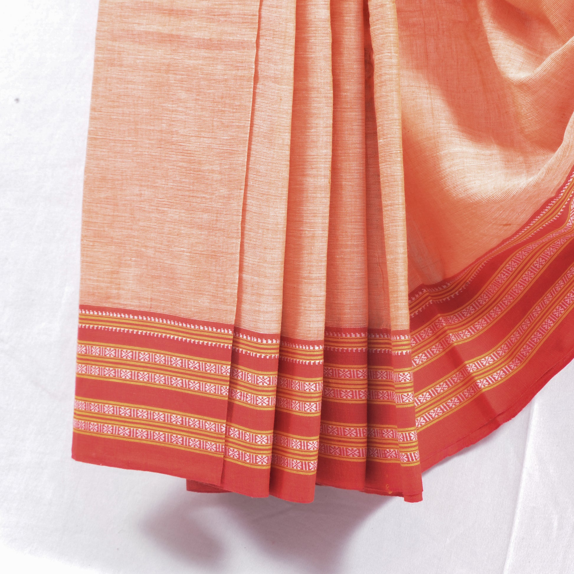 This stunning features a vibrant red border highlighted with traditional golden Gadidhadi patterns. The soft peach body creates a graceful and minimalist look, while the bright red border and striped pallu add festive richness — making it perfect for both everyday elegance and celebratory occasions. Lightweight and breathable, it ensures maximum comfort while maintaining a refined and sophisticated drape.